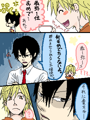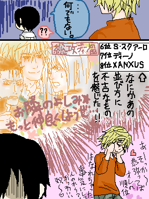 いやー…ザンスクとか探してると一緒にディノスクやディノザンが意外と出てくるのでつい…ウチのディノ氏はキスとか行き過ぎたスキンシップとかは一切浮気と考えません。気持ちの問題というか、気持ちが浮ついたら「浮気」なんだろ?みたいな。 雲雀さんの場合、基本的に他人に心を許さないため自分が心を許さないとやらない積極的な行為は大抵浮気と判断。自分の気持ちが一個体にしか向かないから他者もそんなモンだと思ってる。イタ男にはやや窮屈と思われ。 …そんな前提がなけりゃさっぱり解らん様なもの描いちまった…;(因みに1ページ目で雲雀さんが不愉快と言っているのは人気投票結果発表カラーページでの1〜5位の群れの事) 何はともあれ、雲雀さん1位おめでとうございました!!