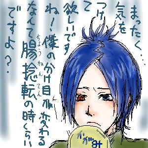 久々にイラストアップしてみたら、骸さんの分け目はんたいだった・・・!! 今までこんな間違いしてこなかったのにorz というか、骸さん描く時に気を付けてるのってそこ位なのに;;今回更新した絵、ラクガキとして描き出したもんだから気ぃ抜けっぱなしだったんでしょうね;まあ、御愛敬って事で…!! にしてもディノ氏の新ヴォイス…やっぱり慣れません;ハスキーならハスキーで、もうちょっと大人っぽく演じちゃって良いんじゃないでしょうかね。やっぱり声より何より演技が…微妙に…苦、手、です;アニリボ自体が全体的に演技が「若い」感じの人が多いのでディーノさんまでそうだと、全体の釣り合いの取れて無さが出ちゃうのかも…… でもやっぱり、「手懐ける」発言にはドキドキしてしまうvv