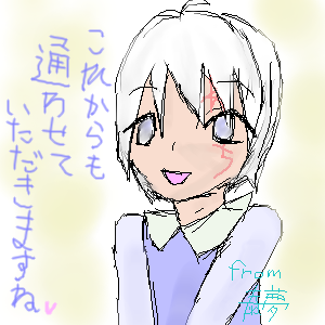 可愛いイラストありがとう御座います!&コメント遅れてスミマセンでした; アレン君ですよねwすごくお上手で感激しましたvv 私服っぽいところがまたイイですね♡ それと手書きのコメントありがとう御座いました^^* 名前までいれてくれて・・・(ホロリ すごく気に入ったのでブログに載せますね!!